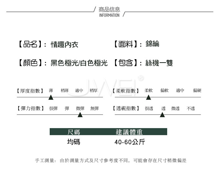 首頁 情趣服飾 性感絲襪,褲襪 珠光明月.水光高彈薄透貼膚長筒絲襪【白色】 UX-24260504 珠光明月.水光高彈薄透貼膚長筒絲襪【白色】 無: - 數量 / 12345678910 原價 /299元 優惠價 /99元 ※ 還差 $1,000 元即可免運費,點選下方本店商品繼續選購 我要搶購 加入我的慾望清單 我要搶購 加入我的慾望清單 產品特色 產品規格 退換貨須知 ■內容物:絲襪一雙 ■適穿尺寸:FREESIZE ■彈性:微彈 ■未撐開平量尺寸正負誤差1~2cm,1吋=2.54cm ■注意事項:基於保障消費者個人衛生,此貼身衣物恕不接受退換貨。 (如為商品本身暇疵,接受七日內換貨,請勿試穿,謝謝您) 情趣服飾 俏皮學生 專屬女僕 溫柔小護士 靚麗女警/氣質空姐/OL秘書 民國旗袍/古典肚兜 日式和服 萌寵動物套裝 其它COS服 性感睡衣 狂野連身衣 情趣比基尼 絲襪性感貓裝 網狀性感貓裝 火辣馬甲 丁字褲/內褲 蕾絲吊襪帶 性感絲襪,褲襪 熱銷TOP5